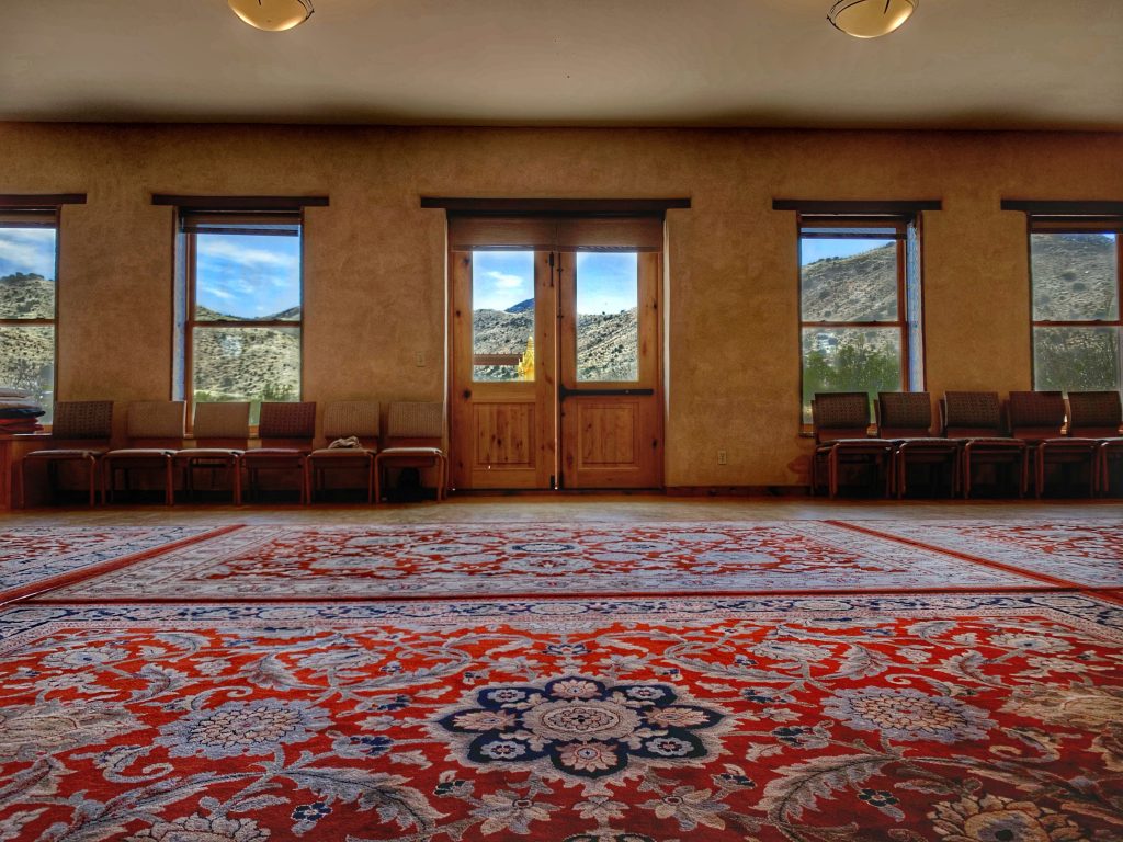 • Main Hall – The Main Hall, our primary Lower Campus group meeting space, is made of adobe brick, finished with American clay interior walls and features cork flooring and carpets, and can accommodate up to 125 people. Guests are welcome to use chairs or meditation cushions for seating.  Speakers, a mixing board, and 2 projectors are available for talks and presentations. We also offer translation booths and equipment for rent to multi-lingual groups.