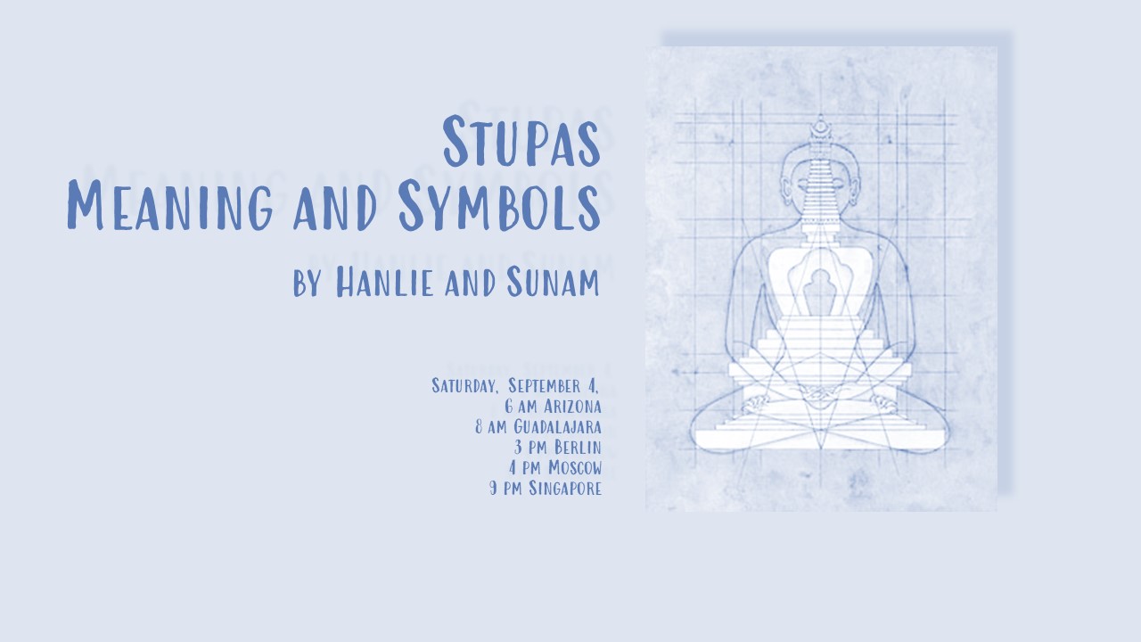 "Stupas in Time and Space" by Hanlie and Sunam Have you ever been curious about stupas? A long time ago, great teachers were cremated, but sometimes they were buried in a seated, meditative position with a mound of earth covering them up. Thus, the domed shape of the stupa came to represent a person seated...